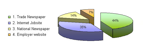 Result 1: The results show clearly that No1. Trade newspapers (44% of the votes) are still the most popular way of finding jobs. This may be due to the fact that trade newspapers are much more focused to a specific area.
