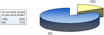 Our March survey asked our users whether they drink alcohol in their lunch break. Luckily we can reveal that the majority of the people who responded, have done with a vote of confidence and reveal they do not drink in their lunch break. In fact we had a huge response, with 83% saying 'NO', they did not drink at lunchtime. This left only 17% of respondees admitting to drinking at lunch. It would be interesting to find out how many of these people, interpret drinking as having a social, swift half or in fact they mean staying in the pub for the lunch hour and end up having a couple to be on their merry way.